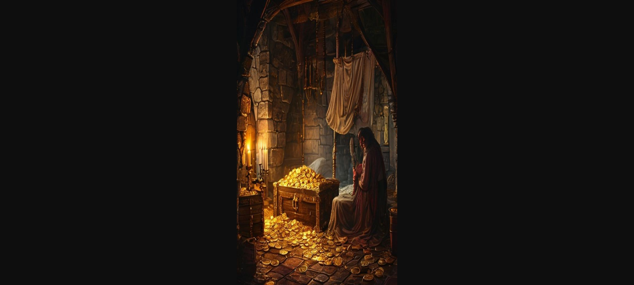 Chambre sombre d'un château médiéval, éclairée à la bougie. Un coffre débordant de pièces d'or. Un serviteur à genoux compte les pièces. Le Seigneur dort en arrière-plan.